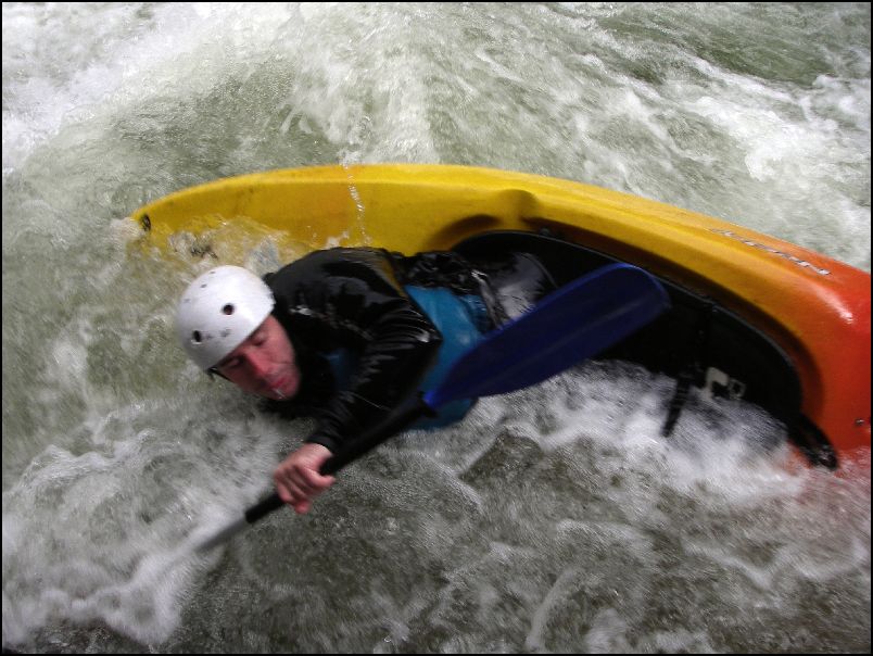 V sobotu jsme se rozhodli zopakovat si Isel. Tentokrát měl už „jen“ 250cm. Nižší stav paradoxně prohloubil žumpy za kameny a zvětšil válce a tak nejeden znás se zachraňoval eskymováním. Tentokrát jsem nabyl dojmu, že konečně jedu pravou čtyrku. Jeden z válců si vyšlápl i na Martina, držel ho tak dlouho, až mu došla trpělivost (taky dech) a z lodi vylezl. Za odměnu si zaplaval ve studeném proudu.