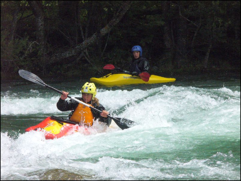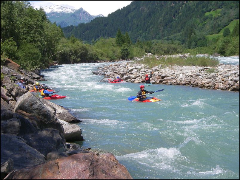 Se čtvrtkem přišlo vyvrcholení našeho činění- Isel. Stav 275cm zaručoval dostatek zábavy. Po prohlédnutí katarktu, jsme dali lodě na vodu asi 1km nad Hubenem (wwIII- IV). Silný proud s válci vytvářel záludné žumpy za dobře ukrytými překážkami. Na soutoku s Schwarzach se k nám připojila část druhé skupiny (Pepa, Radka a Lucka) Sílu proudu ochutnala Radka, která neustála útok jednoho z válečků a zaplavala si až k přítoku dalšího z potoků Kalserbachu. Kajak jsme chytili o dalších 500m níže. V St Johannu se k nám přidala Zuzka a já jsem přesedl do C2 k Martě. Široká řeka se zdála být jednoduchá, ale na méně zkušené členy naší partičky připravila nespočet pastiček (wwII-III) .Do několik znich se jim podařilo nalákat naše spolujezdce. Končili jsme v Ainetu. Pod mostem je k dispozici krásná vlna umožňující surfování.